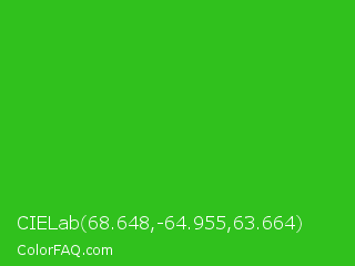 CIELab 68.648,-64.955,63.664 Color is a normal green color and the nearest color is Lime Green #32cd32. Hex code #30c11d and RGB value is rgb(48,193,29). In RGB color space, this color is composed of 19% red, 76% green, 11% blue, In CMYK color space, this color is composed of 75% cyan, 0% magenta, 85% yellow , 24% black , In HSL color space, this color has a hue angle of 113° , 74% saturation and 44% lightness.