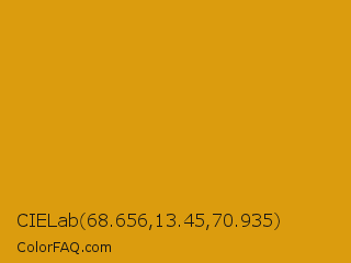 CIELab 68.656,13.45,70.935 Color is a normal orange color and the nearest color is Gamboge #e49b0f. Hex code #db9c0e and RGB value is rgb(219,156,14). In RGB color space, this color is composed of 86% red, 61% green, 5% blue, In CMYK color space, this color is composed of 0% cyan, 29% magenta, 94% yellow , 14% black , In HSL color space, this color has a hue angle of 42° , 88% saturation and 46% lightness.