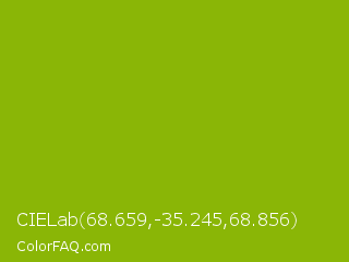 CIELab 68.659,-35.245,68.856 Color is a normal lime color and the nearest color is Apple Green #8db600. Hex code #8ab606 and RGB value is rgb(138,182,6). In RGB color space, this color is composed of 54% red, 71% green, 2% blue, In CMYK color space, this color is composed of 24% cyan, 0% magenta, 97% yellow , 29% black , In HSL color space, this color has a hue angle of 75° , 94% saturation and 37% lightness.