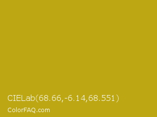 CIELab 68.66,-6.14,68.551 Color is a normal yellow color and the nearest color is Sahara #b7a214. Hex code #bda814 and RGB value is rgb(189,168,20). In RGB color space, this color is composed of 74% red, 66% green, 8% blue, In CMYK color space, this color is composed of 0% cyan, 11% magenta, 89% yellow , 26% black , In HSL color space, this color has a hue angle of 53° , 81% saturation and 41% lightness.