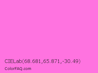 CIELab 68.681,65.871,-30.49 Color is a light magenta color and the nearest color is Pale Magenta #f984e5. Hex code #ff73e0 and RGB value is rgb(255,115,224). In RGB color space, this color is composed of 100% red, 45% green, 88% blue, In CMYK color space, this color is composed of 0% cyan, 55% magenta, 12% yellow , 0% black , In HSL color space, this color has a hue angle of 313° , 100% saturation and 73% lightness.