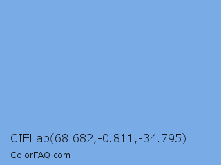 CIELab 68.682,-0.811,-34.795 Color is a light blue color and the nearest color is Aero #7cb9e8. Hex code #79abe6 and RGB value is rgb(121,171,230). In RGB color space, this color is composed of 47% red, 67% green, 90% blue, In CMYK color space, this color is composed of 47% cyan, 26% magenta, 0% yellow , 10% black , In HSL color space, this color has a hue angle of 212° , 69% saturation and 69% lightness.