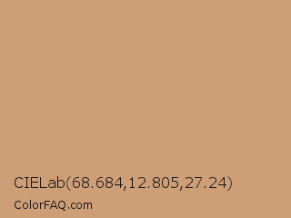 CIELab 68.684,12.805,27.24 Color is a light orange color and the nearest color is Antique Brass #cd9575. Hex code #ce9e77 and RGB value is rgb(206,158,119). In RGB color space, this color is composed of 81% red, 62% green, 47% blue, In CMYK color space, this color is composed of 0% cyan, 23% magenta, 42% yellow , 19% black , In HSL color space, this color has a hue angle of 27° , 47% saturation and 64% lightness.