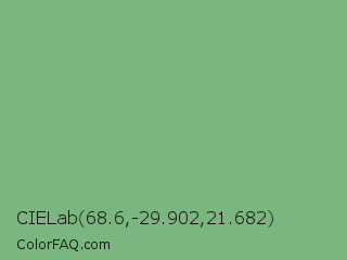 CIELab 68.6,-29.902,21.682 Color is a normal green color and the nearest color is Iguana Green #71bc78. Hex code #7bb57f and RGB value is rgb(123,181,127). In RGB color space, this color is composed of 48% red, 71% green, 50% blue, In CMYK color space, this color is composed of 32% cyan, 0% magenta, 30% yellow , 29% black , In HSL color space, this color has a hue angle of 124° , 28% saturation and 60% lightness.