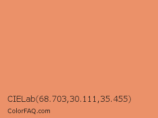 CIELab 68.703,30.111,35.455 Color is a light orange color and the nearest color is Apricot #eb9373. Hex code #eb9169 and RGB value is rgb(235,145,105). In RGB color space, this color is composed of 92% red, 57% green, 41% blue, In CMYK color space, this color is composed of 0% cyan, 38% magenta, 55% yellow , 8% black , In HSL color space, this color has a hue angle of 18° , 76% saturation and 67% lightness.
