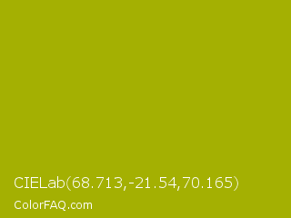 CIELab 68.713,-21.54,70.165 Color is a normal yellow color and the nearest color is Pistachio Green #9dc209. Hex code #a4b002 and RGB value is rgb(164,176,2). In RGB color space, this color is composed of 64% red, 69% green, 1% blue, In CMYK color space, this color is composed of 7% cyan, 0% magenta, 99% yellow , 31% black , In HSL color space, this color has a hue angle of 64° , 98% saturation and 35% lightness.