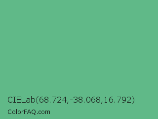 CIELab 68.724,-38.068,16.792 Color is a normal green color and the nearest color is Silver Tree #66b58f. Hex code #60b988 and RGB value is rgb(96,185,136). In RGB color space, this color is composed of 38% red, 73% green, 53% blue, In CMYK color space, this color is composed of 48% cyan, 0% magenta, 26% yellow , 27% black , In HSL color space, this color has a hue angle of 147° , 39% saturation and 55% lightness.