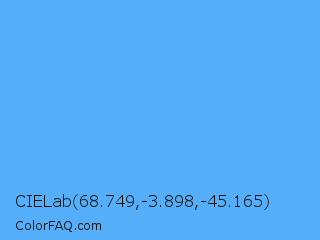 CIELab 68.749,-3.898,-45.165 Color is a light blue color and the nearest color is Blue Jeans #5dadec. Hex code #54aef9 and RGB value is rgb(84,174,249). In RGB color space, this color is composed of 33% red, 68% green, 98% blue, In CMYK color space, this color is composed of 66% cyan, 30% magenta, 0% yellow , 2% black , In HSL color space, this color has a hue angle of 207° , 93% saturation and 65% lightness.