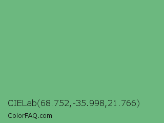 CIELab 68.752,-35.998,21.766 Color is a normal green color and the nearest color is Iguana Green #71bc78. Hex code #6cb87f and RGB value is rgb(108,184,127). In RGB color space, this color is composed of 42% red, 72% green, 50% blue, In CMYK color space, this color is composed of 41% cyan, 0% magenta, 31% yellow , 28% black , In HSL color space, this color has a hue angle of 135° , 35% saturation and 57% lightness.