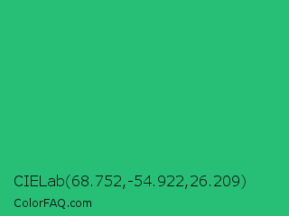 CIELab 68.752,-54.922,26.209 Color is a normal green color and the nearest color is Green Crayola #1cac78. Hex code #27bf76 and RGB value is rgb(39,191,118). In RGB color space, this color is composed of 15% red, 75% green, 46% blue, In CMYK color space, this color is composed of 80% cyan, 0% magenta, 38% yellow , 25% black , In HSL color space, this color has a hue angle of 151° , 66% saturation and 45% lightness.