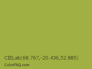 CIELab 68.767,-20.436,52.885 Color is a normal yellow color and the nearest color is Brass #b5a642. Hex code #a1b042 and RGB value is rgb(161,176,66). In RGB color space, this color is composed of 63% red, 69% green, 26% blue, In CMYK color space, this color is composed of 9% cyan, 0% magenta, 63% yellow , 31% black , In HSL color space, this color has a hue angle of 68° , 45% saturation and 47% lightness.