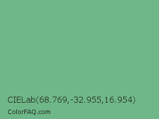 CIELab 68.769,-32.955,16.954 Color is a normal green color and the nearest color is Silver Tree #66b58f. Hex code #6fb788 and RGB value is rgb(111,183,136). In RGB color space, this color is composed of 44% red, 72% green, 53% blue, In CMYK color space, this color is composed of 39% cyan, 0% magenta, 26% yellow , 28% black , In HSL color space, this color has a hue angle of 141° , 33% saturation and 58% lightness.