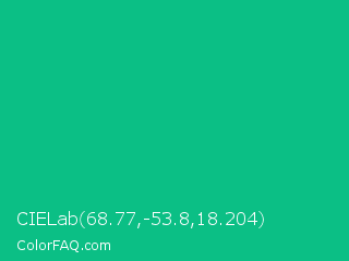 CIELab 68.77,-53.8,18.204 Color is a normal green color and the nearest color is Mountain Meadow Crayola #1ab385. Hex code #0bbf85 and RGB value is rgb(11,191,133). In RGB color space, this color is composed of 4% red, 75% green, 52% blue, In CMYK color space, this color is composed of 94% cyan, 0% magenta, 30% yellow , 25% black , In HSL color space, this color has a hue angle of 161° , 89% saturation and 40% lightness.