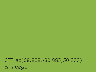 CIELab 68.808,-30.982,50.322 Color is a normal green color and the nearest color is Sushi #87ab39. Hex code #8cb547 and RGB value is rgb(140,181,71). In RGB color space, this color is composed of 55% red, 71% green, 28% blue, In CMYK color space, this color is composed of 23% cyan, 0% magenta, 61% yellow , 29% black , In HSL color space, this color has a hue angle of 82° , 44% saturation and 49% lightness.