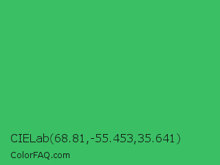 CIELab 68.81,-55.453,35.641 Color is a normal green color and the nearest color is Medium Sea Green #3cb371. Hex code #3abf64 and RGB value is rgb(58,191,100). In RGB color space, this color is composed of 23% red, 75% green, 39% blue, In CMYK color space, this color is composed of 70% cyan, 0% magenta, 48% yellow , 25% black , In HSL color space, this color has a hue angle of 139° , 53% saturation and 49% lightness.
