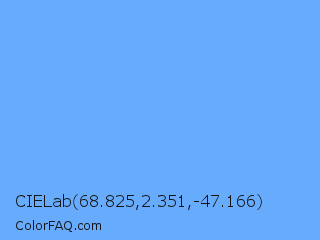 CIELab 68.825,2.351,-47.166 Color is a light blue color and the nearest color is French Sky Blue #77b5fe. Hex code #67abfd and RGB value is rgb(103,171,253). In RGB color space, this color is composed of 40% red, 67% green, 99% blue, In CMYK color space, this color is composed of 59% cyan, 32% magenta, 0% yellow , 1% black , In HSL color space, this color has a hue angle of 213° , 97% saturation and 70% lightness.