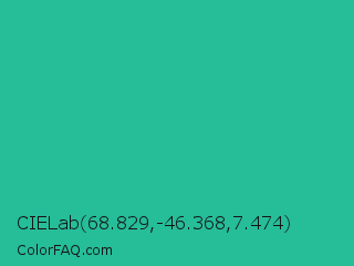 CIELab 68.829,-46.368,7.474 Color is a normal cyan color and the nearest color is Mountain Meadow #30ba8f. Hex code #26bd99 and RGB value is rgb(38,189,153). In RGB color space, this color is composed of 15% red, 74% green, 60% blue, In CMYK color space, this color is composed of 80% cyan, 0% magenta, 19% yellow , 26% black , In HSL color space, this color has a hue angle of 166° , 67% saturation and 45% lightness.