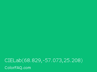 CIELab 68.829,-57.073,25.208 Color is a normal green color and the nearest color is Green Munsell #00a877. Hex code #08c078 and RGB value is rgb(8,192,120). In RGB color space, this color is composed of 3% red, 75% green, 47% blue, In CMYK color space, this color is composed of 96% cyan, 0% magenta, 38% yellow , 25% black , In HSL color space, this color has a hue angle of 157° , 92% saturation and 39% lightness.