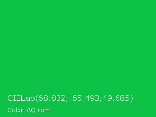 CIELab 68.832,-65.493,49.685 Color is a normal green color and the nearest color is Dark Pastel Green #03c03c. Hex code #0dc246 and RGB value is rgb(13,194,70). In RGB color space, this color is composed of 5% red, 76% green, 27% blue, In CMYK color space, this color is composed of 93% cyan, 0% magenta, 64% yellow , 24% black , In HSL color space, this color has a hue angle of 139° , 87% saturation and 41% lightness.