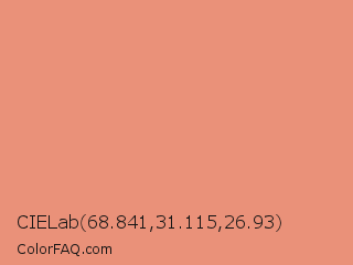 CIELab 68.841,31.115,26.93 Color is a light red color and the nearest color is Dark Salmon #e9967a. Hex code #ea9179 and RGB value is rgb(234,145,121). In RGB color space, this color is composed of 92% red, 57% green, 47% blue, In CMYK color space, this color is composed of 0% cyan, 38% magenta, 48% yellow , 8% black , In HSL color space, this color has a hue angle of 13° , 73% saturation and 70% lightness.