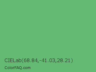 CIELab 68.84,-41.03,28.21 Color is a normal green color and the nearest color is Fern #63b76c. Hex code #65ba73 and RGB value is rgb(101,186,115). In RGB color space, this color is composed of 40% red, 73% green, 45% blue, In CMYK color space, this color is composed of 46% cyan, 0% magenta, 38% yellow , 27% black , In HSL color space, this color has a hue angle of 130° , 38% saturation and 56% lightness.