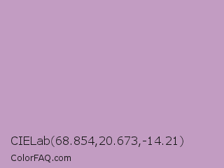 CIELab 68.854,20.673,-14.21 Color is a light magenta color and the nearest color is Lilac #c8a2c8. Hex code #c29cc2 and RGB value is rgb(194,156,194). In RGB color space, this color is composed of 76% red, 61% green, 76% blue, In CMYK color space, this color is composed of 0% cyan, 20% magenta, 0% yellow , 24% black , In HSL color space, this color has a hue angle of 300° , 24% saturation and 69% lightness.