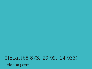 CIELab 68.873,-29.99,-14.933 Color is a normal cyan color and the nearest color is Pelorous #3eabbf. Hex code #3db8c2 and RGB value is rgb(61,184,194). In RGB color space, this color is composed of 24% red, 72% green, 76% blue, In CMYK color space, this color is composed of 69% cyan, 5% magenta, 0% yellow , 24% black , In HSL color space, this color has a hue angle of 185° , 52% saturation and 50% lightness.