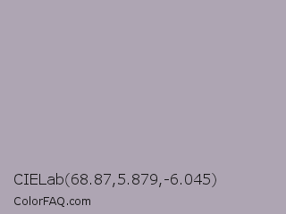 CIELab 68.87,5.879,-6.045 Color is a light purple color and the nearest color is Spun Pearl #aaabb7. Hex code #aea5b3 and RGB value is rgb(174,165,179). In RGB color space, this color is composed of 68% red, 65% green, 70% blue, In CMYK color space, this color is composed of 3% cyan, 8% magenta, 0% yellow , 30% black , In HSL color space, this color has a hue angle of 279° , 8% saturation and 67% lightness.