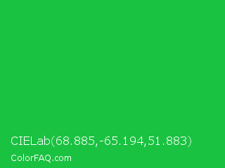 CIELab 68.885,-65.194,51.883 Color is a normal green color and the nearest color is Dark Pastel Green #03c03c. Hex code #1ac241 and RGB value is rgb(26,194,65). In RGB color space, this color is composed of 10% red, 76% green, 25% blue, In CMYK color space, this color is composed of 87% cyan, 0% magenta, 66% yellow , 24% black , In HSL color space, this color has a hue angle of 134° , 76% saturation and 43% lightness.