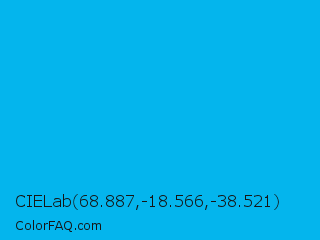 CIELab 68.887,-18.566,-38.521 Color is a normal blue color and the nearest color is Cyan Process #00b7eb. Hex code #04b5ed and RGB value is rgb(4,181,237). In RGB color space, this color is composed of 2% red, 71% green, 93% blue, In CMYK color space, this color is composed of 98% cyan, 24% magenta, 0% yellow , 7% black , In HSL color space, this color has a hue angle of 194° , 97% saturation and 47% lightness.