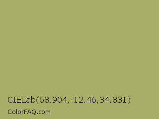 CIELab 68.904,-12.46,34.831 Color is a normal yellow color and the nearest color is Green Smoke #a4af6e. Hex code #a8ad68 and RGB value is rgb(168,173,104). In RGB color space, this color is composed of 66% red, 68% green, 41% blue, In CMYK color space, this color is composed of 3% cyan, 0% magenta, 40% yellow , 32% black , In HSL color space, this color has a hue angle of 64° , 30% saturation and 54% lightness.
