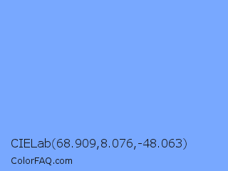 CIELab 68.909,8.076,-48.063 Color is a light blue color and the nearest color is French Sky Blue #77b5fe. Hex code #78a8ff and RGB value is rgb(120,168,255). In RGB color space, this color is composed of 47% red, 66% green, 100% blue, In CMYK color space, this color is composed of 53% cyan, 34% magenta, 0% yellow , 0% black , In HSL color space, this color has a hue angle of 219° , 100% saturation and 74% lightness.