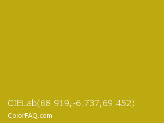 CIELab 68.919,-6.737,69.452 Color is a normal yellow color and the nearest color is Sahara #b7a214. Hex code #bda910 and RGB value is rgb(189,169,16). In RGB color space, this color is composed of 74% red, 66% green, 6% blue, In CMYK color space, this color is composed of 0% cyan, 11% magenta, 92% yellow , 26% black , In HSL color space, this color has a hue angle of 53° , 84% saturation and 40% lightness.