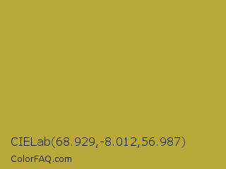 CIELab 68.929,-8.012,56.987 Color is a normal yellow color and the nearest color is Brass #b5a642. Hex code #b8aa3a and RGB value is rgb(184,170,58). In RGB color space, this color is composed of 72% red, 67% green, 23% blue, In CMYK color space, this color is composed of 0% cyan, 8% magenta, 68% yellow , 28% black , In HSL color space, this color has a hue angle of 53° , 52% saturation and 47% lightness.