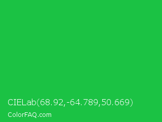 CIELab 68.92,-64.789,50.669 Color is a normal green color and the nearest color is Dark Pastel Green #03c03c. Hex code #1bc244 and RGB value is rgb(27,194,68). In RGB color space, this color is composed of 11% red, 76% green, 27% blue, In CMYK color space, this color is composed of 86% cyan, 0% magenta, 65% yellow , 24% black , In HSL color space, this color has a hue angle of 135° , 76% saturation and 43% lightness.