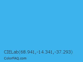 CIELab 68.941,-14.341,-37.293 Color is a normal blue color and the nearest color is Picton Blue #45b1e8. Hex code #3eb3eb and RGB value is rgb(62,179,235). In RGB color space, this color is composed of 24% red, 70% green, 92% blue, In CMYK color space, this color is composed of 74% cyan, 24% magenta, 0% yellow , 8% black , In HSL color space, this color has a hue angle of 199° , 81% saturation and 58% lightness.