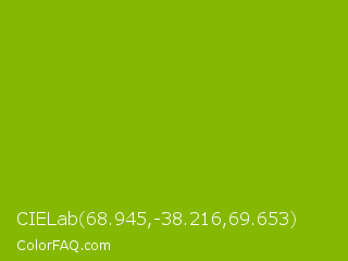 CIELab 68.945,-38.216,69.653 Color is a normal lime color and the nearest color is Apple Green #8db600. Hex code #85b800 and RGB value is rgb(133,184,0). In RGB color space, this color is composed of 52% red, 72% green, 0% blue, In CMYK color space, this color is composed of 28% cyan, 0% magenta, 100% yellow , 28% black , In HSL color space, this color has a hue angle of 77° , 100% saturation and 36% lightness.