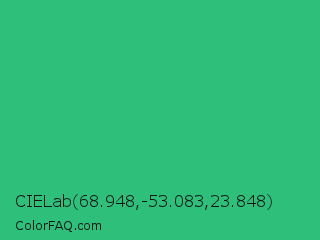 CIELab 68.948,-53.083,23.848 Color is a normal green color and the nearest color is Mountain Meadow #30ba8f. Hex code #2ebf7b and RGB value is rgb(46,191,123). In RGB color space, this color is composed of 18% red, 75% green, 48% blue, In CMYK color space, this color is composed of 76% cyan, 0% magenta, 36% yellow , 25% black , In HSL color space, this color has a hue angle of 152° , 61% saturation and 46% lightness.