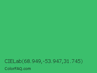 CIELab 68.949,-53.947,31.745 Color is a normal green color and the nearest color is Medium Sea Green #3cb371. Hex code #3bbf6c and RGB value is rgb(59,191,108). In RGB color space, this color is composed of 23% red, 75% green, 42% blue, In CMYK color space, this color is composed of 69% cyan, 0% magenta, 43% yellow , 25% black , In HSL color space, this color has a hue angle of 142° , 53% saturation and 49% lightness.