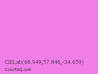 CIELab 68.949,57.846,-34.659 Color is a light magenta color and the nearest color is Lavender Magenta #ee82ee. Hex code #f07ee8 and RGB value is rgb(240,126,232). In RGB color space, this color is composed of 94% red, 49% green, 91% blue, In CMYK color space, this color is composed of 0% cyan, 48% magenta, 3% yellow , 6% black , In HSL color space, this color has a hue angle of 304° , 79% saturation and 72% lightness.