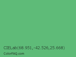 CIELab 68.951,-42.526,25.668 Color is a normal green color and the nearest color is Fern #63b76c. Hex code #5ebb78 and RGB value is rgb(94,187,120). In RGB color space, this color is composed of 37% red, 73% green, 47% blue, In CMYK color space, this color is composed of 50% cyan, 0% magenta, 36% yellow , 27% black , In HSL color space, this color has a hue angle of 137° , 41% saturation and 55% lightness.