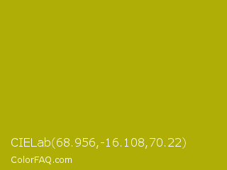 CIELab 68.956,-16.108,70.22 Color is a normal yellow color and the nearest color is Sahara #b7a214. Hex code #aeae06 and RGB value is rgb(174,174,6). In RGB color space, this color is composed of 68% red, 68% green, 2% blue, In CMYK color space, this color is composed of 0% cyan, 0% magenta, 97% yellow , 32% black , In HSL color space, this color has a hue angle of 60° , 93% saturation and 35% lightness.
