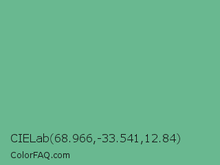 CIELab 68.966,-33.541,12.84 Color is a normal green color and the nearest color is Silver Tree #66b58f. Hex code #69b890 and RGB value is rgb(105,184,144). In RGB color space, this color is composed of 41% red, 72% green, 56% blue, In CMYK color space, this color is composed of 43% cyan, 0% magenta, 22% yellow , 28% black , In HSL color space, this color has a hue angle of 150° , 36% saturation and 57% lightness.