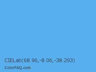 CIELab 68.96,-8.06,-38.293 Color is a light blue color and the nearest color is Blue Jeans #5dadec. Hex code #59b0ed and RGB value is rgb(89,176,237). In RGB color space, this color is composed of 35% red, 69% green, 93% blue, In CMYK color space, this color is composed of 62% cyan, 26% magenta, 0% yellow , 7% black , In HSL color space, this color has a hue angle of 205° , 80% saturation and 64% lightness.