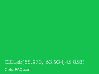 CIELab 68.973,-63.934,45.858 Color is a normal green color and the nearest color is Malachite #0bda51. Hex code #15c24f and RGB value is rgb(21,194,79). In RGB color space, this color is composed of 8% red, 76% green, 31% blue, In CMYK color space, this color is composed of 89% cyan, 0% magenta, 59% yellow , 24% black , In HSL color space, this color has a hue angle of 140° , 80% saturation and 42% lightness.