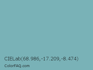 CIELab 68.986,-17.209,-8.474 Color is a normal cyan color and the nearest color is Neptune #7cb7bb. Hex code #79b2b7 and RGB value is rgb(121,178,183). In RGB color space, this color is composed of 47% red, 70% green, 72% blue, In CMYK color space, this color is composed of 34% cyan, 3% magenta, 0% yellow , 28% black , In HSL color space, this color has a hue angle of 185° , 30% saturation and 60% lightness.