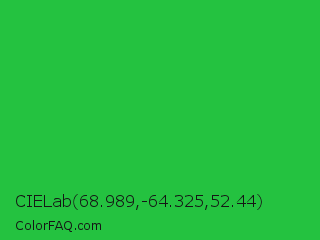 CIELab 68.989,-64.325,52.44 Color is a normal green color and the nearest color is Lime Green #32cd32. Hex code #24c240 and RGB value is rgb(36,194,64). In RGB color space, this color is composed of 14% red, 76% green, 25% blue, In CMYK color space, this color is composed of 81% cyan, 0% magenta, 67% yellow , 24% black , In HSL color space, this color has a hue angle of 131° , 69% saturation and 45% lightness.