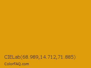 CIELab 68.989,14.712,71.885 Color is a normal orange color and the nearest color is Gamboge #e49b0f. Hex code #de9c0a and RGB value is rgb(222,156,10). In RGB color space, this color is composed of 87% red, 61% green, 4% blue, In CMYK color space, this color is composed of 0% cyan, 30% magenta, 95% yellow , 13% black , In HSL color space, this color has a hue angle of 41° , 91% saturation and 45% lightness.