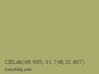 CIELab 68.995,-11.748,31.807 Color is a normal yellow color and the nearest color is Green Smoke #a4af6e. Hex code #a8ad6e and RGB value is rgb(168,173,110). In RGB color space, this color is composed of 66% red, 68% green, 43% blue, In CMYK color space, this color is composed of 3% cyan, 0% magenta, 36% yellow , 32% black , In HSL color space, this color has a hue angle of 65° , 28% saturation and 55% lightness.