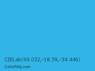 CIELab 69.032,-18.59,-34.446 Color is a normal blue color and the nearest color is Scooter #2ebfd4. Hex code #30b5e6 and RGB value is rgb(48,181,230). In RGB color space, this color is composed of 19% red, 71% green, 90% blue, In CMYK color space, this color is composed of 79% cyan, 21% magenta, 0% yellow , 10% black , In HSL color space, this color has a hue angle of 196° , 78% saturation and 55% lightness.